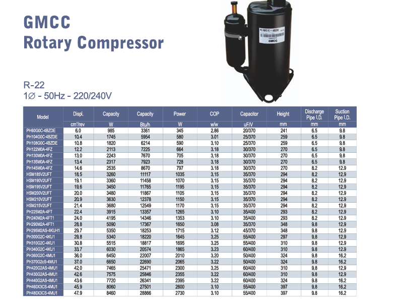 | Model | Displ. | Capacity | Capacity | Power | COP |